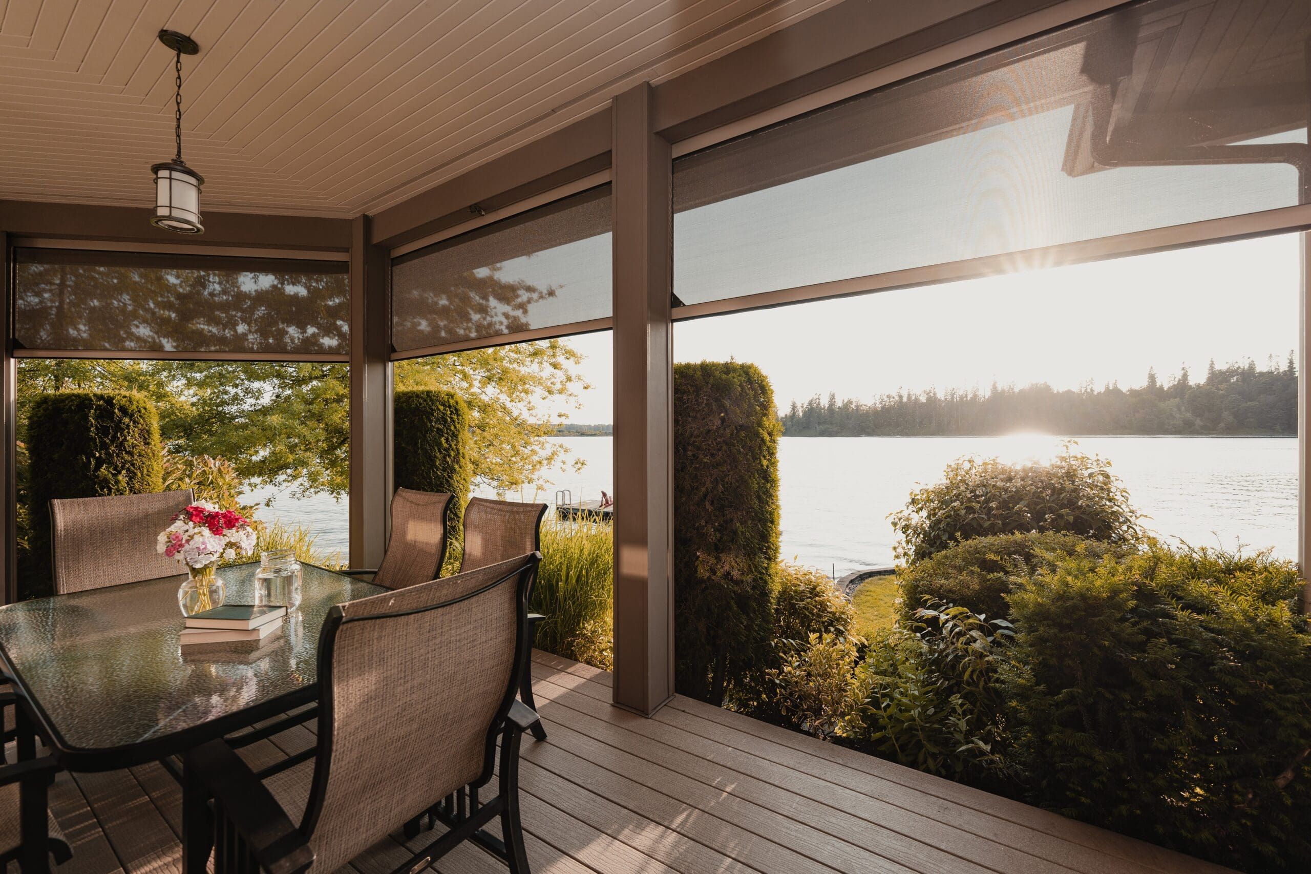 Phantom motorized screens help block the bugs and bring in refreshing air that blends the indoors and out.